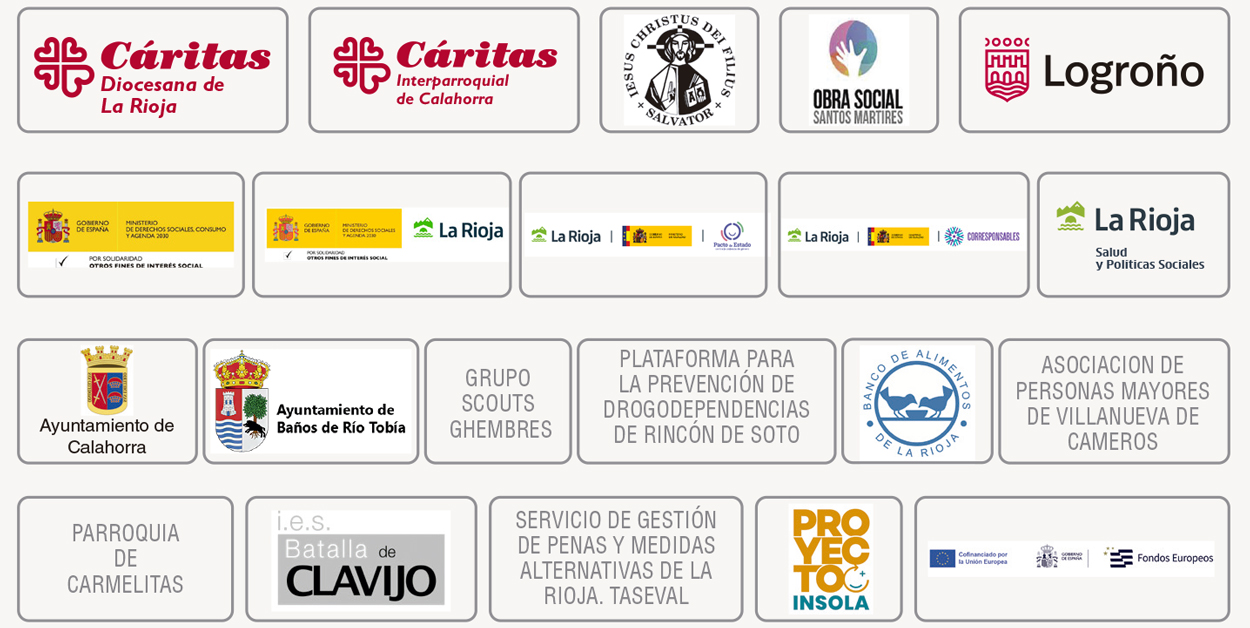 El apoyo de las instituciones es vital para nuestra actividad. Cáritas fomentó nuestro nacimiento y hoy en día nos da soporte en todo lo que hacemos. También queremos dar las gracias a la Comunidad Salvatoriana por la cesión de gran parte de nuestros espacios, a la Obra Social Santos Mártires por acercarnos a La Rioja Baja y al Instituto Batalla de Clavijo de Logroño por ayudarnos a mejorar nuestras instalaciones. Asimismo, son importantes los convenios con las Administraciones Públicas para sostener parte de nuestros programas; y el apoyo de los ayuntamientos que promueven Escuelas de Familias o actos para la captación de fondos.
